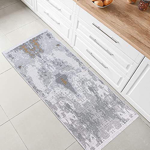 Fashion4Home Matta med kort lugg – boho kelim-matta, vardagsrumsmatta, sovrum och köksmatta, matta löpare, hallmatta, barnrum matta abstract-grå-guld, hälsningar: 60 x 180 cm