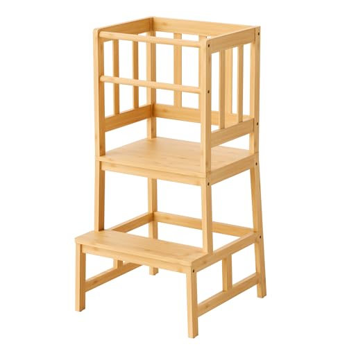 Wiltec Hjälpa till-pall för barn 46 x 46 x 90 cm stegpall i bambu med räcke kökspall till kök barnpall barnstol montessori