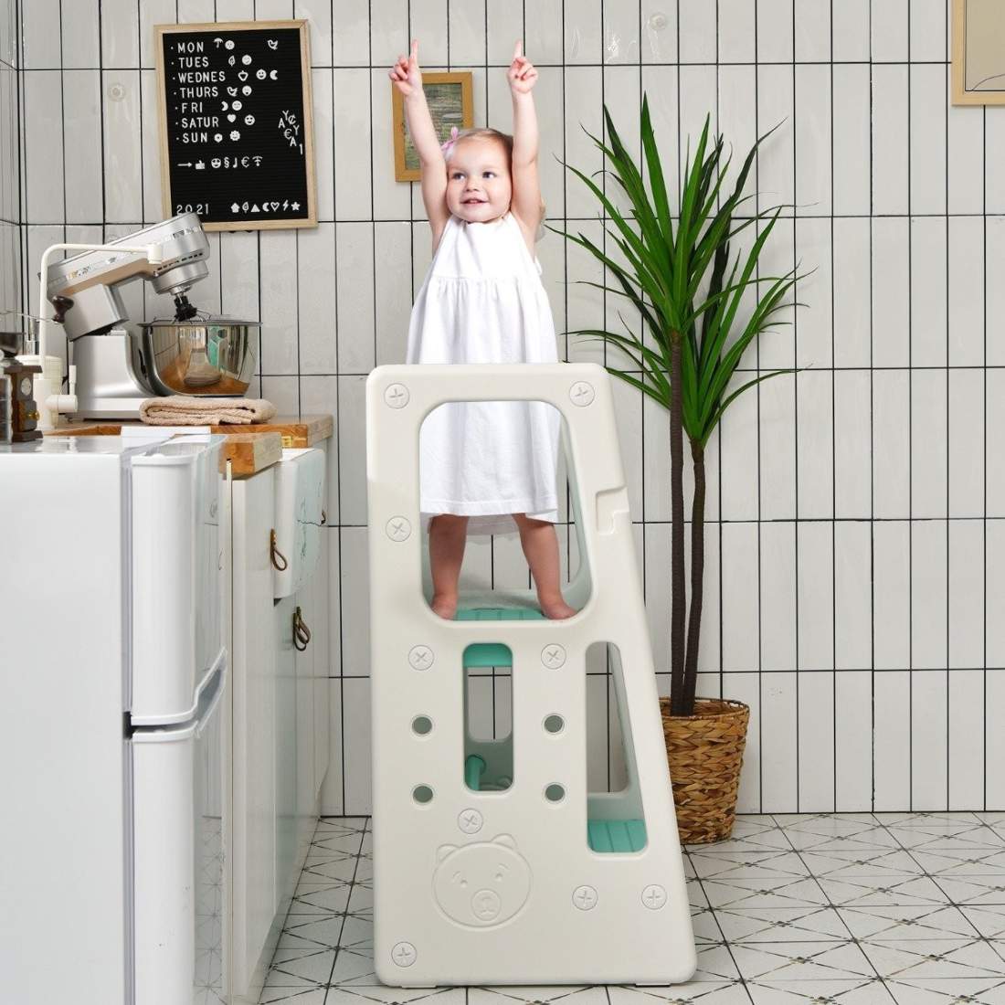 Kökspall för barn med dubbla säkerhetshandräcken & 3 justerbara höjder & halkfria fötter Gröna