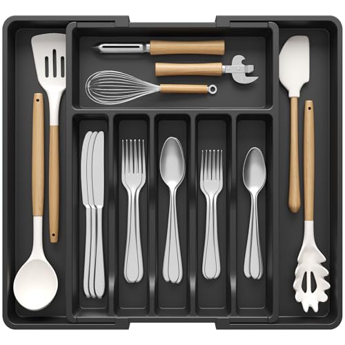 Lifewit Besticklåda för lådor, justerbar köksredskapshållare, djup 42,4 cm, stor köksförvaring, utbyggbar till 47 cm, bestickhållare, redskapshållare för skedar/gafflar, kniv, svart