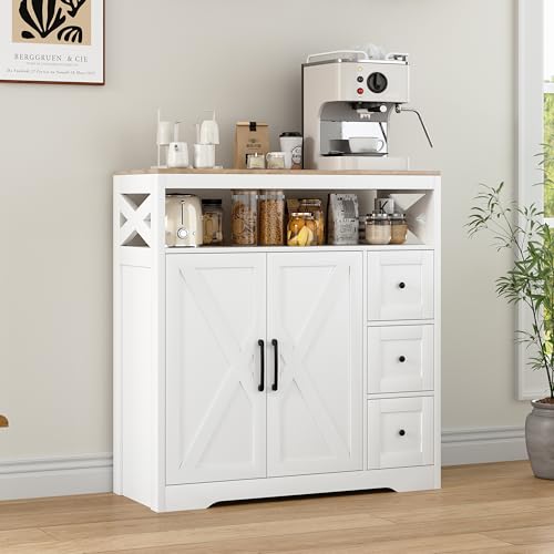 ADFUNIT Köksskåp, skänk med 3 lådor och 4 dörrar, bufféskåp med justerbar hylla, köksbyrå för vardagsrum, kök, matsal, natur och vit