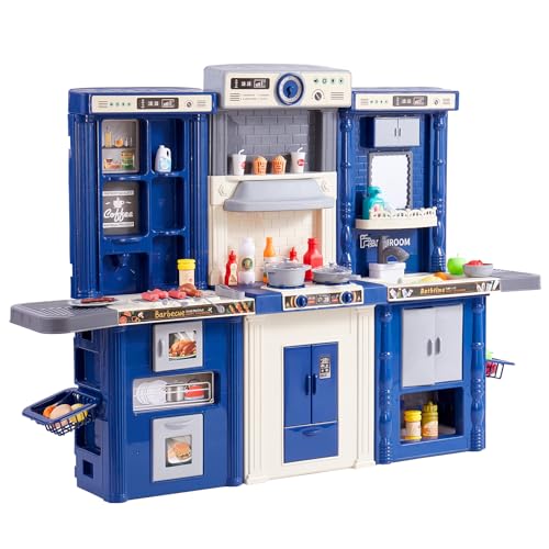 VEVOR Barnkök, 3-i-1 barnköksset med simulerad spray, ljud, lampor, kökstillbehör 74 st för förskolebarn, barn 3–8 år, blå