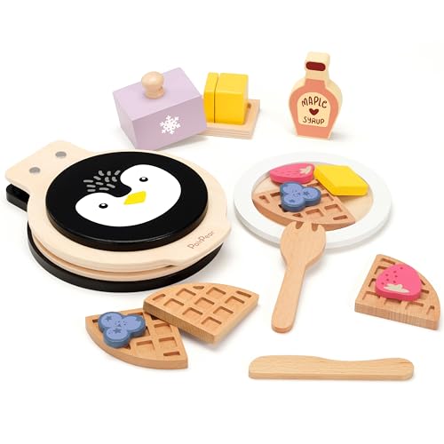PairPear Våffeljärn av trä leksak livsmedelssats rollspel kökstillbehör trä bakleksaksset frukost och teuppsättningar för barn gåva för flickor och pojkar från 3 år trä våffelmaskin