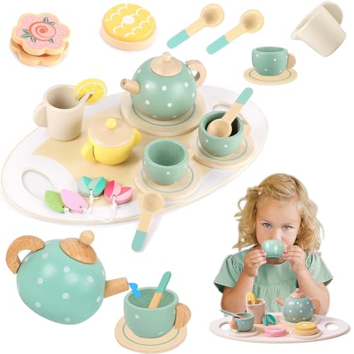 Smartwo Te-set i trä för barn, te- och kakset för flickkalas, kökstillbehör för barn, träspel, Tea Party-flicka, flickpresent 2 3 4 5 6 år