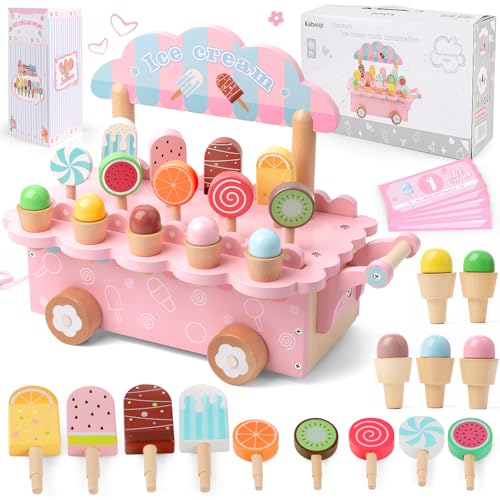 Träglassset för barn – rollspel matvagn butik med meny och falska pengar – lek kökstillbehör present till 3–7 år gamla flickor pojkar