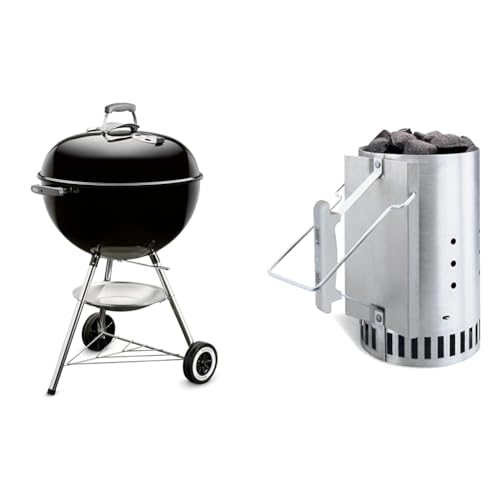 Weber Original Kettle Kolgrill, Ø 57cm grillyta, BBQ-grill med porslinsemaljerad lock & gryta, locktermometer, One-Touch rengöringssystem - Svart (1341504) & Weber Rapidfire Grillstarter Stor