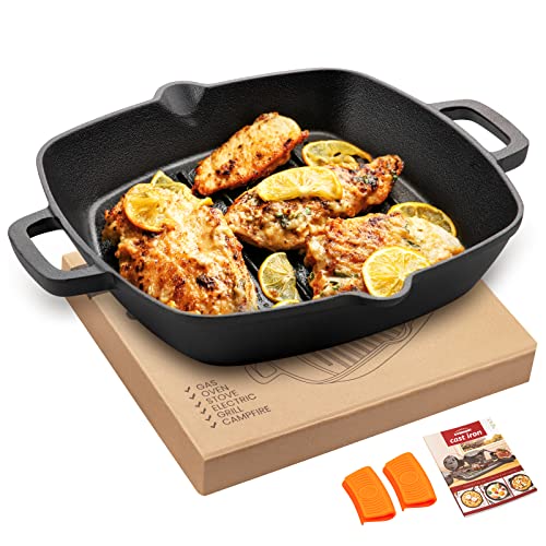 OVERMONT Grillpanna i gjutjärn med handtag – gjutjärnspanna kvadratisk 26 cm – förbrända stekpannor – gjutjärnspanna för gasgrill, ugn, kolgrill