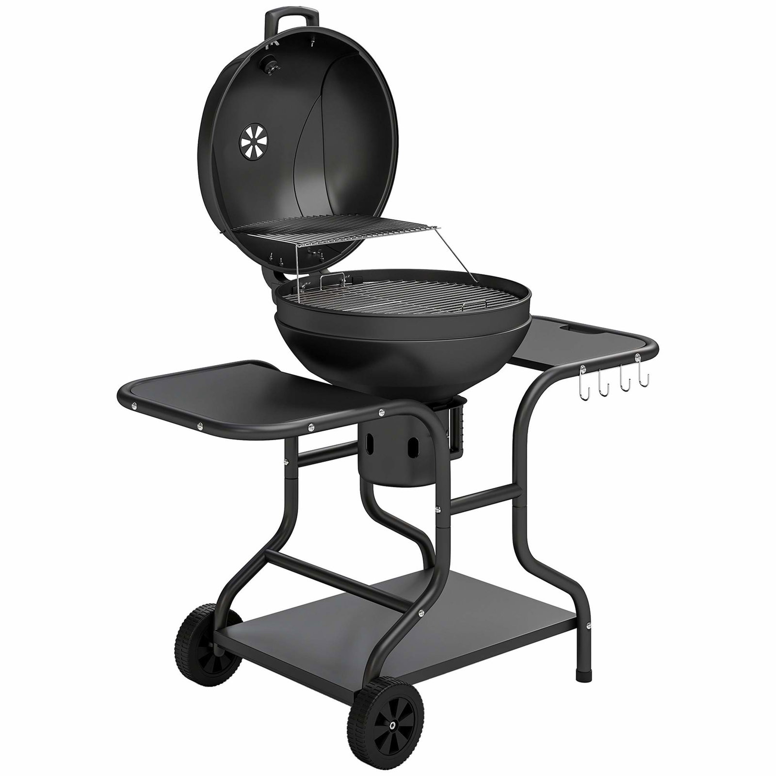 Kolgrill med lock & 2 fällbara sidobord & 8 krokar & termometer & flasköppnare