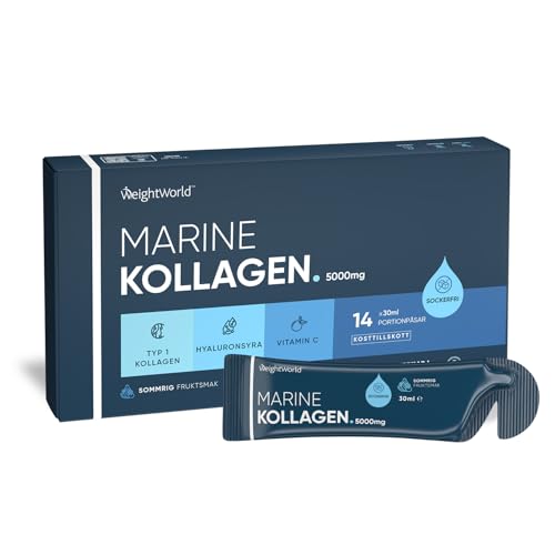 Kollagen påsar 5000 mg – För hud, ben och brosk (EFSA) – Hydrolyserat marint kollagen med C-vitamin och hyaluronsyra – 14 sockerfria kollagenpåsar, 30 ml vardera – Sommarfruktssmak – WeightWorld