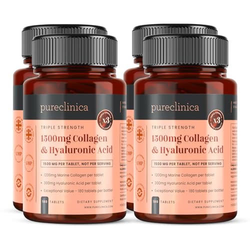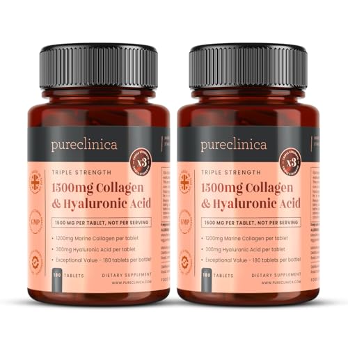 Pureclinica 1500 mg x 360 tabletter (2 flaskor med 180 stycken).1200 mg av UltraColl kollagen och 300 mg av hyaluronsyra per tablett.( 12 månaders förbrukning)