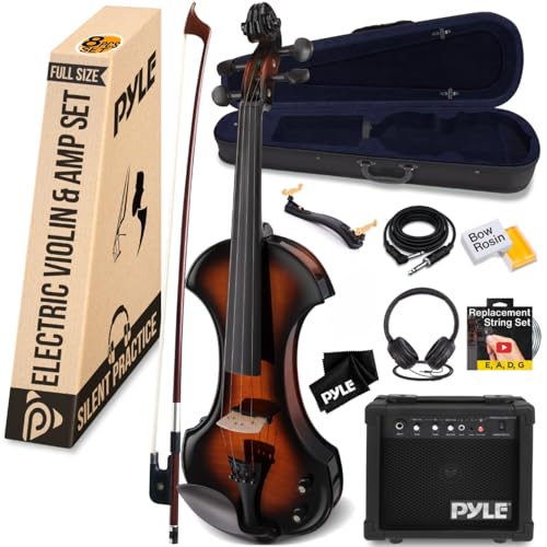Pyle E-Violin i Fullstorlek – 4/4 Massivträ Violin med Förstärkarsystem, Skumfodral, Ebenholtsbeslag, Brasilträbåge, Extra Strängar, Kolofonium, Ton- & Volymkontroller, Hörlurar Inkluderade