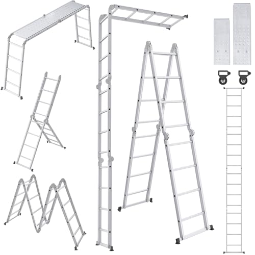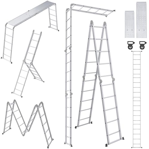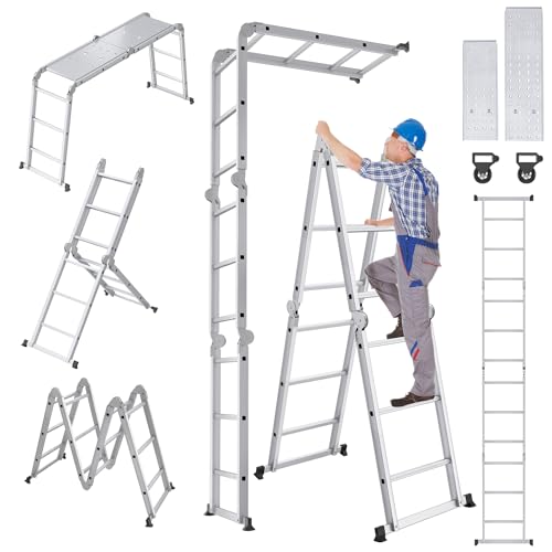 UISEBRT multifunktionsstege 4 x 4 aluminium med plattform, 6-i-1 multifunktionsstege, 470 cm, hopfällbar stege, aluminiumstege, kombistege, multifunktionsstege upp till 150 kg, silver
