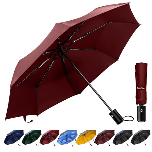 TechRise Paraply, kompakt, starkt och vindtätt paraply, automatiskt paraply, vikbart, lätt och bärbart reseparaply, golfparaply, paraply för regn, Röd, M