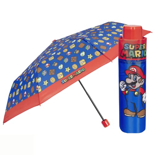 PERLETTI Super Mario Bros Hopfällbart Kompakt Paraply för Barn - Supermario Manuellt Vindtät Skärm Paraply för Pojkar Blå och Röd - Mini Paraply för Resa Pojke 5 6 7 År - Diameter 91 cm