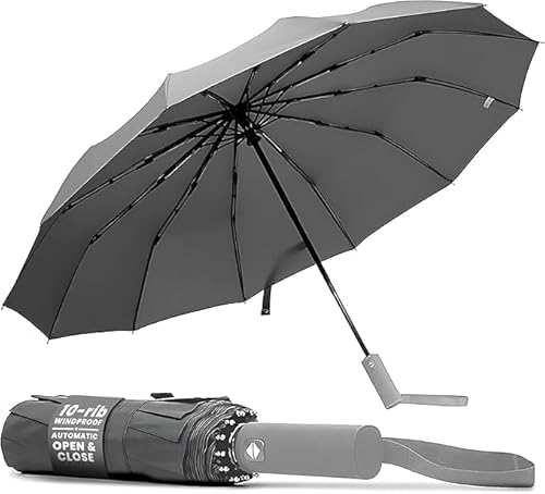 KEPLIN Fällbart reseparaply kompakt, automatisk öppning och stäng handtag, vindtätt starkt, golf 10 ribbor, smalt starkt, lätt vikbart, kompakt vindtätt paraply