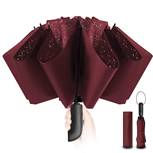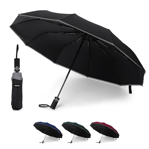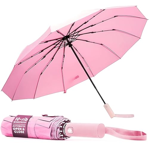 Vindtätt resehopfällbart paraply automatiskt, BESTKEE stort regn hopfällbart kompakt paraply bärbart snabbtorkande med automatisk öppning/stängningsknapp, halkfritt handtag