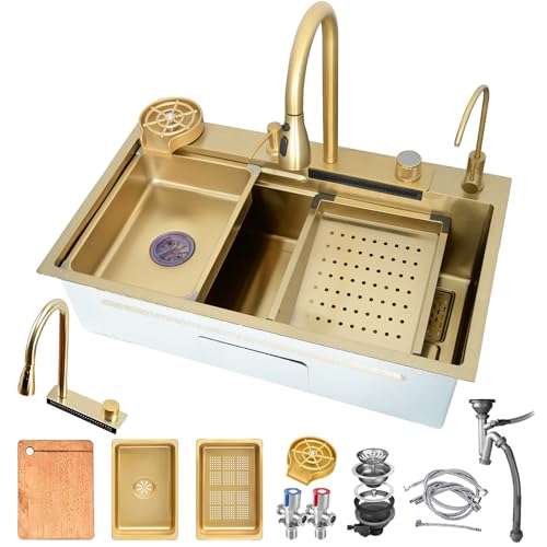 DSMRLEOP Guldfärgad vattenfall-diskbänk – 75 x 45 cm enkelhandfat av nanorostfritt stål med gyllene utdragbar kran, komplett tillbehörsset, multifunktionell arbetsstation för moderna kök