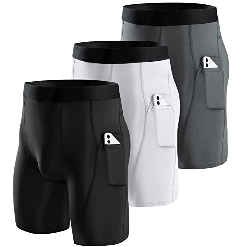 Niksa 3-pack kompressionsshorts för män, löpning baslager, shorts, kompression träningsshorts med mobiltelefonfickor täta torra och andningsbara sportshorts för cykling, yoga, boxning, gym,