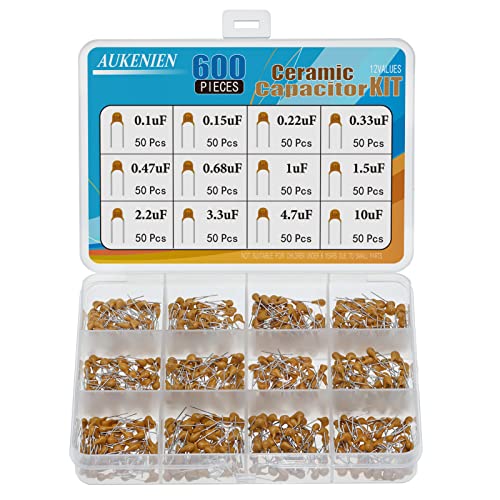 AUKENIEN 12 värde 600 stycken keramiska kondensatorer set kondensatorer sortiment 100nF 0.1uF 0.15uF 0.22uF 0.33uF 0.47uF 0,68uF 1uF 1.5uF 2.2uF 3.3uF 4.7uF 10uF keramisk kondensatorkapacitet set