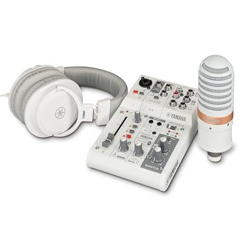 Yamaha AG03MK2 Allt-i-ett Live Streamingpaket, inkluderar 3-kanals mixer, YCM01-kondensatormikrofon och YH-MT1-hörlurar, för Windows, Mac, iOS och Android, vit