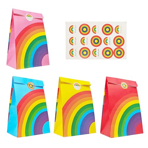 12 stycken färgglada papperspartipåsar med klistermärken, bärbara regnbåge små presentpåsar, regnbåge konfetti papperspåsar, återanvändbara vackra godispåsar för bröllop födelsedagsfest