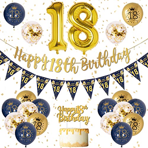 18-årsdag dekoration – girlang banderoller, ballonger och konfetti för pojkar i marinblå och guld