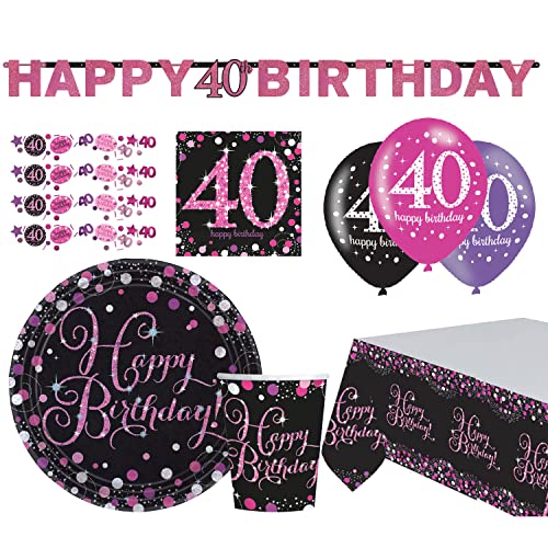 Amscan 9050 0410-66 – Partyset Happy Birthday 40, 41 delar, tallrikar, koppar, servetter, ballonger, konfetti, bordsduk, festkedja, engångsporslin och dekoration, födelsedag, fest