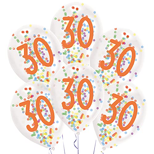 Amscan 9909839 – Latexballonger konfetti, nummer 30, 6 stycken, ca 27,5 cm, med fyllning, nummerballonger, födelsedag, dekoration, gåva, vuxen