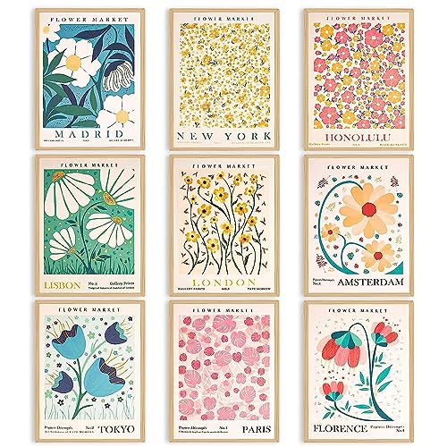 Hyxodjy Set med 9 eleganta blommiga affischer, blommarknadsposter, vintageaffischbilder, affischer och dekorativ konst med blommönster och marknad, väggdekoration för vardagsrum (20 x 30 cm utan ram)