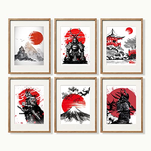 YUMKNOW Väggdekor i japansk konst - utan ram 8 x 10 set med 6, modern minimalistisk asiatisk orientalisk dekor för vardagsrum, Samuraj Armor Warriors tryck, affischer för sovrum, Japan röd vit konst