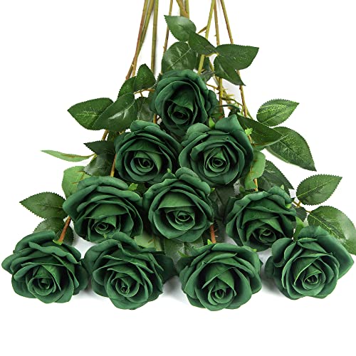 DuHouse Konstgjorda rosor, falska silkesblommor, brudbuketter med enkla långa plaststjälkar för arrangemang, bröllopsbord, bordsuppsats, fest, heminredning (mörkgrön)
