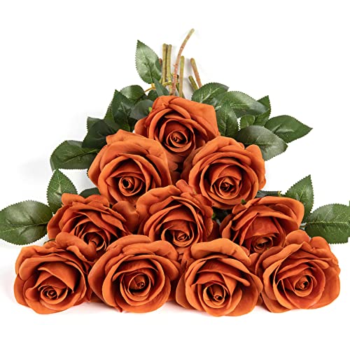 DuHouse Konstgjorda rosor, falska silkesblommor, brudbuketter med enkla långa plaststjälkar för arrangemang, bröllopsbord, bordsuppsats, fest, heminredning (bränd orange)