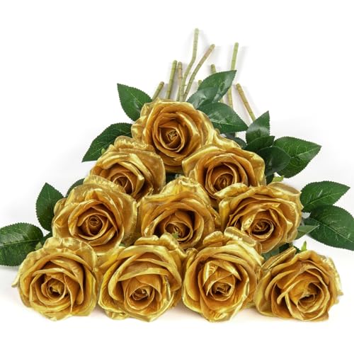 DuHouse Konstgjorda rosor, 10 st, falska silkesblommor, realistiska brudbuketter med enkla långa plaststjälkar för arrangemang, bröllop, bordsuppsats, fest, heminredning (guld)