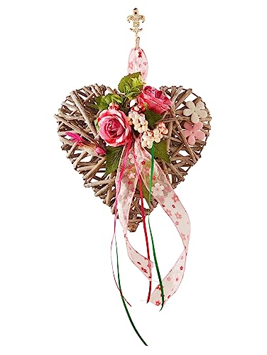 Hjärta av trä med konstgjorda rosor bär och rosett för att hänga hängande dekoration, kransar, hjärtform, blomarrangemang, rosenhuvuden, dörrkrans, väggkrans, alla hjärtans dag, bröllopsdekoration,