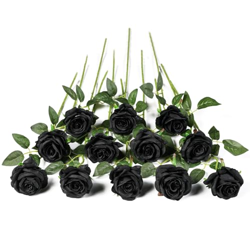 Kisflower Rosor, konstgjorda blommor, realistisk, enkel stjälk, blommor i silke, rosbukett för bröllopsfest, kontor, heminredning, halloween-dekoration, 12 st (svart)