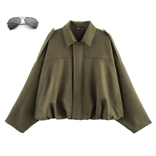 YCYATS Mocka jacka dam, trendig bomberjacka kort, överdimensionerad övergångsjacka av konstmocka, höstjacka retro Y2K streetwear, Armégrön, M