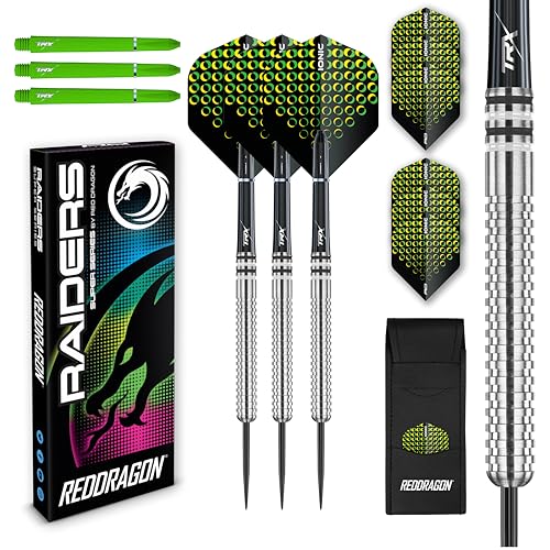 RED DRAGON Raider 1: 23g Steel Tip Tungsten Darts Set - Grön stil Set med professionella pilar med skaft (stammar), flyg och kontantkort.