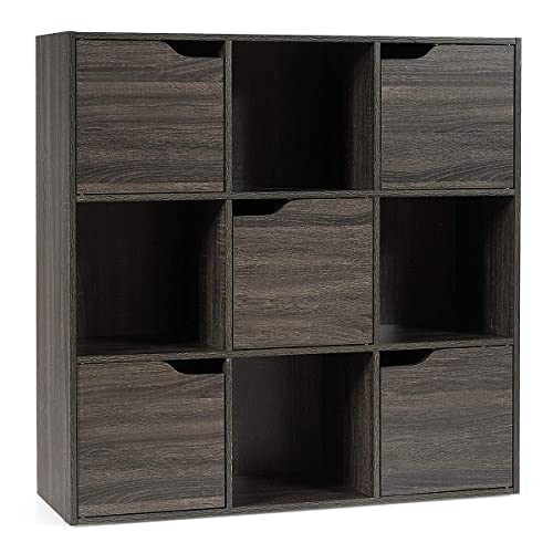 GIANTEX Bokskåp med 9 fack, bokhylla kubhylla med 5 dörrar, trästående hylla, kontorshylla, fristående, förvaringshylla för böcker, DVD-skivor, leksaker (grå)