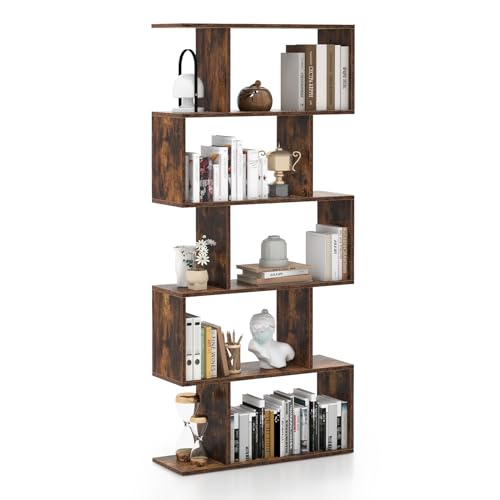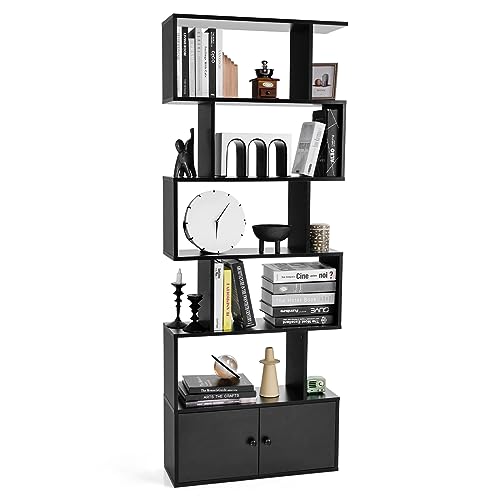 GOPLUS Bokhylla, hylla med 5 nivåer, S-formad stående hylla med dörrar, förvaringshylla | bostadshylla | kontorshylla | rumsavdelare hylla i trä för vardagsrum och arbetsrum, 70 x 23 x 183 cm (svart)