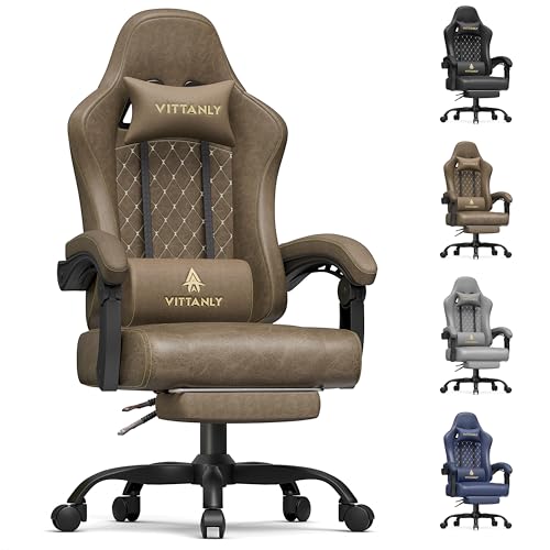 Vittanly Gamingstol med vårkudde, ergonomisk gamingstol med nackstöd, ländryggskudde och fotstöd, höjdjusterbar vridbar spelfåtölj, kontorsstol 150 kg, brun