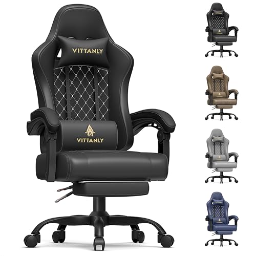 Vittanly Gamingstol med vårkudde, ergonomisk gamingstol med nackstöd, ländryggskudde och fotstöd, höjdjusterbar vridbar spelfåtölj, kontorsstol 150 kg, svart