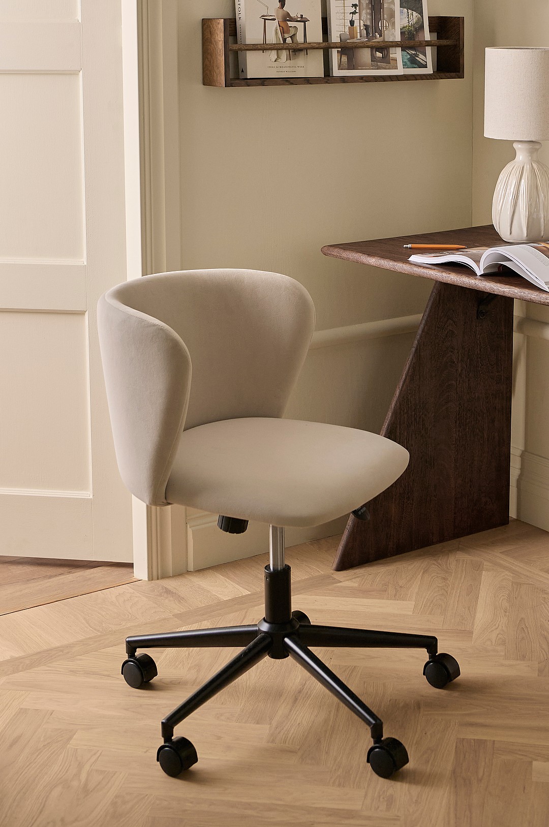 Kontorsstol i sammetsliknande tyg, böjd rygg, beige