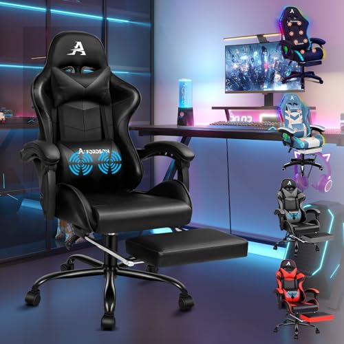 ALFORDSON Spelstol med massageapparat och LED, ergonomisk verkställande kontorsstol med fotstöd, spelstolar för kontor och spel med RGB-belysning, konstläder, grå