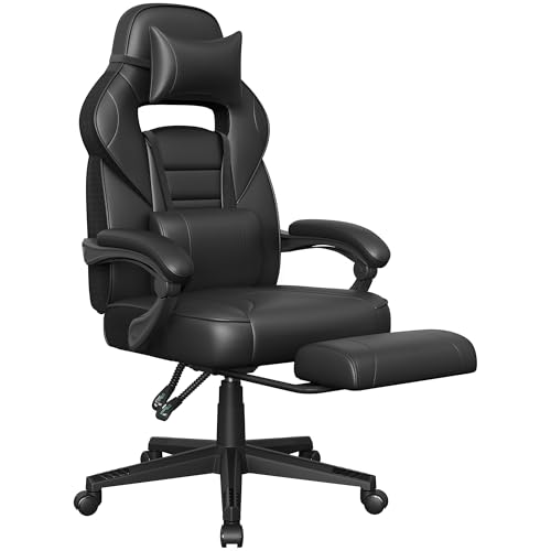 SONGMICS Kontorsstol, spelstol, justerbar, teleskopisk fotstöd, stavmekanism, nackstöd, ländstöd, belastning 150 kg, bläcksvart OBG073B05