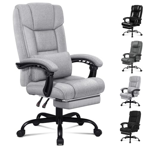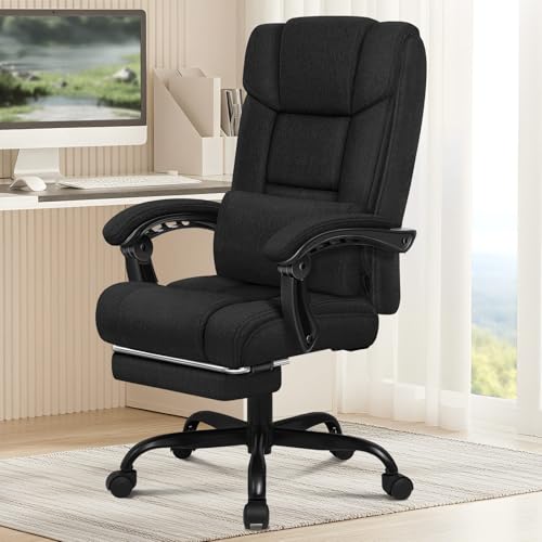 ALFORDSON Ergonomisk kontorsstol med fotstöd, justerbar nätstol med hög rygg, svängbar stol med 150° lutbar 360° svängbar lutande fåtölj, linnetyg, svart