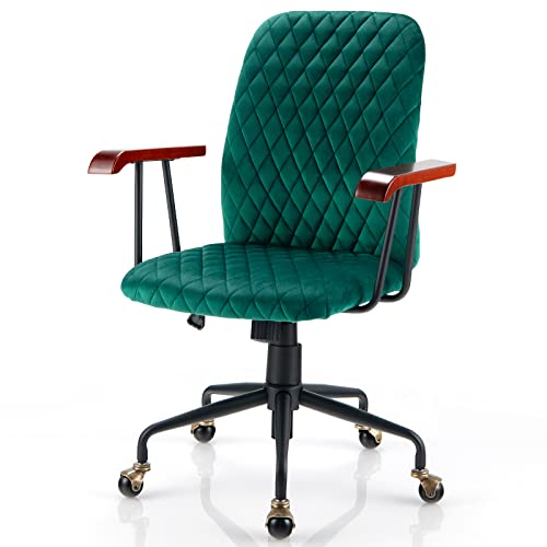 Giantex Retro sammet kontorsstol justerbar höjd med hjul, ergonomisk kontorsstol med vadderat säte och armstöd i trä gummi, vintage stil, belastning 150 kg (grön), FE43672