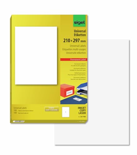 SiGEL La182, 100 multifunktionella etiketter, storlek 21 x 29,7 cm, för bläckstråle/laser/kopiator, 100 ark, vit