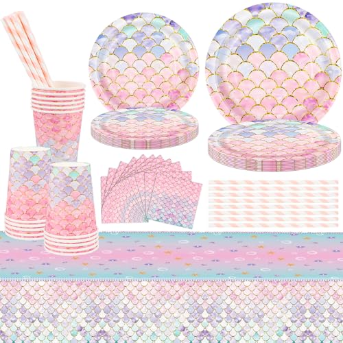 Sjöjungfru födelsedag dekoration, 81 stycken sjöjungfru festservis set barnfödelsedag dekoration, sjöjungfru party tallrik med dukar koppar sugrör servetter för baby dusch födelsedagsfest