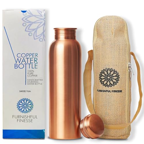 MÖJSKFULL FINESSE vattenflaska av ren koppar, 1 liter ayurvedisk kopparflaska för att dricka mer vatten och sänka ditt sockerintag, 32 dl stort kopparkärl – läckagesäker design, levereras med bärväska