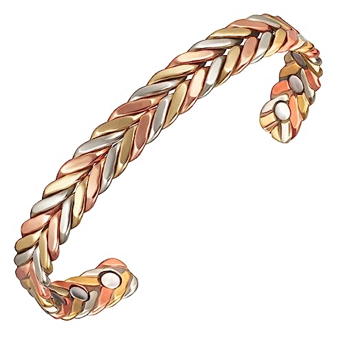 EnerMagiX 16,5 cm trefärgade handgjorda flätade magnetiska koppararmband för kvinnor eller män, smycken av ren koppar